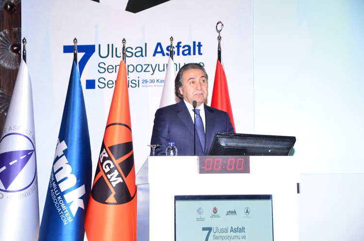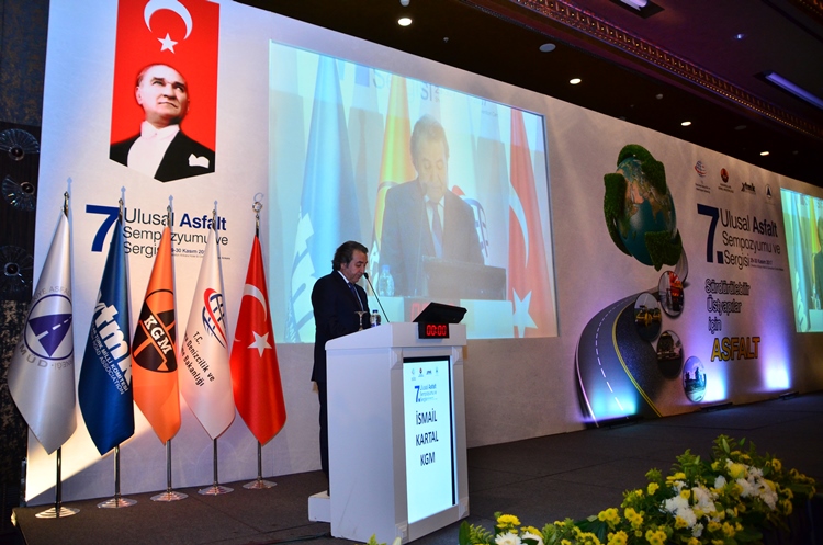 Karayolları Genel Müdürü ve Yollar Türk Milli Komitesi Yönetim Kurulu Başkanı İsmail KARTAL ise konuşmasında, Türkiye’nin bitümlü sıcak karışım üretiminde Avrupa ülkeleri arasında Almanya’dan sonra ikinci sırada yer aldığını belirterek asfalt üretimi ve uygulaması yapan yüklenici, malzeme ve makine tedarikçisi firma sayısının 250’yi aştığını, asfalt üretiminde kullanılan plent sayısının da yaklaşık 750’ye ulaştığını söyledi. Asfalt ve bitüm endüstrisinin, asfaltın çevreye olan etkileri üzerinde uzun yıllardır çalışmalarını sürdürdüğünü belirten KARTAL asfaltın yeniden kullanımı konusuna hız verildiğini ve ülkemizde, ömrünü tamamlayan asfalt kaplamaların yeni yapılacak bitümlü sıcak karışım tabakalarında kullanımı konusunda son yıllarda önemli artışların gerçekleştiğini ve yerinde soğuk geri kazanım çalışmalarının uygulandığını belirtti.